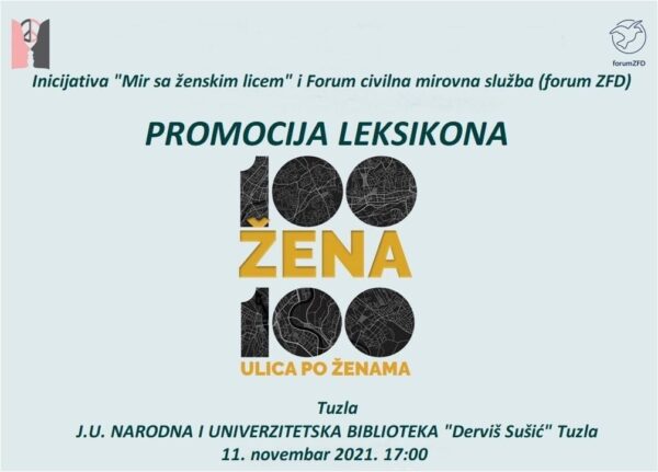 Pozivamo sugrađane na promociju Leksikona „100 žena – 100 ulica po ženama“, koja će se održati u JU NUB „Derviš Sušić“ Tuzla u četvrtak, 11. novembra 2021. godine sa početkom ...
