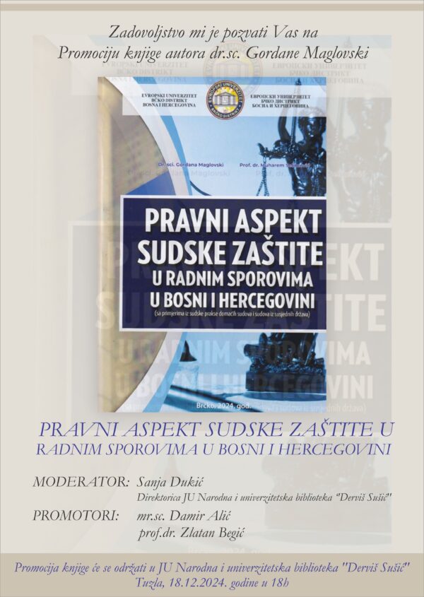 Najava promocije knjige „Pravni aspekt sudske zaštite u radnim sporovima u BiH“ autorice dr.sc. Gordane Maglovski