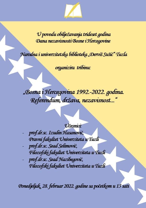 U povodu obilježavanja trideset godina Dana nezavisnosti Bosne i Hercegovine   Narodna i univerzitetska biblioteka “Derviš Sušić” Tuzla organizira  tribinu: