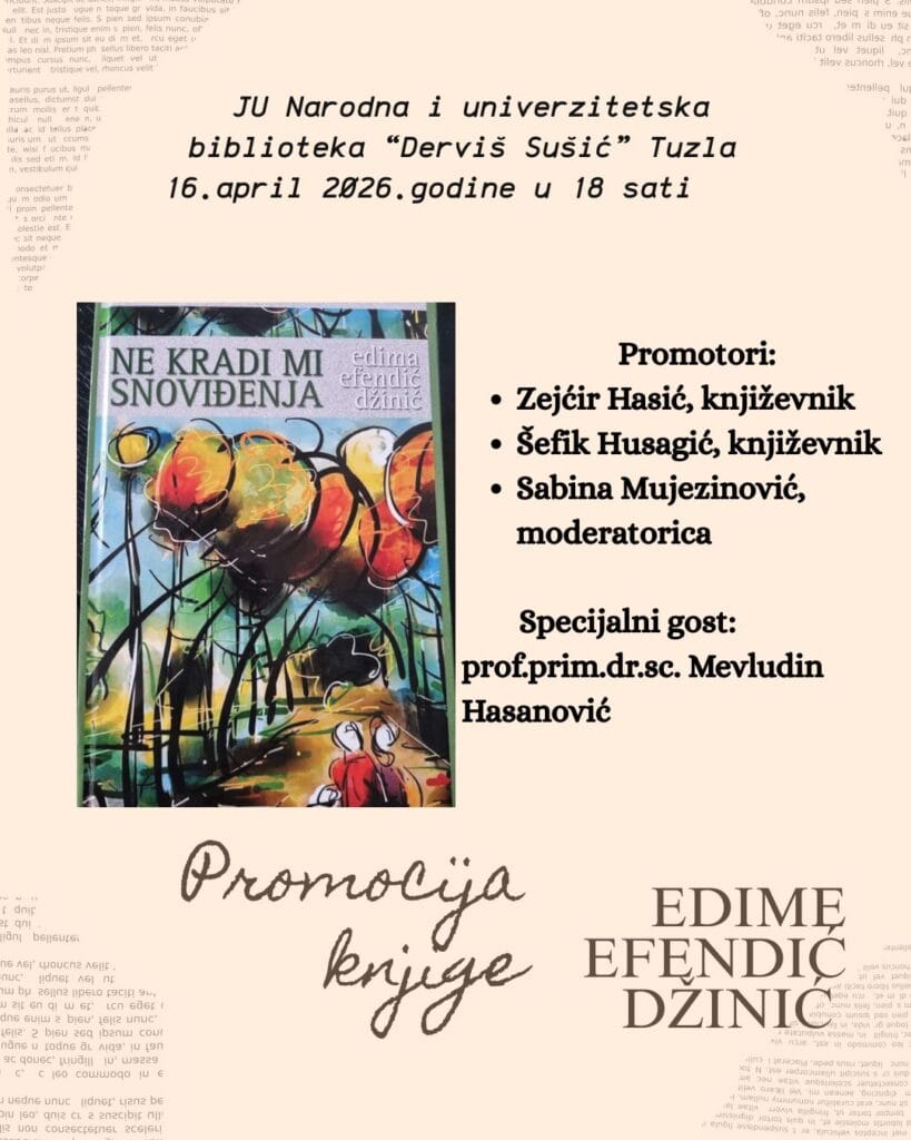 U četvrtak 16. aprila 2026.godine u 18 sati u Biblioteci „Derviš Sušić“ Tuzla održat će se promocija knjige Edime Efendić Džinić „Ne kradi mi snoviđenja“.