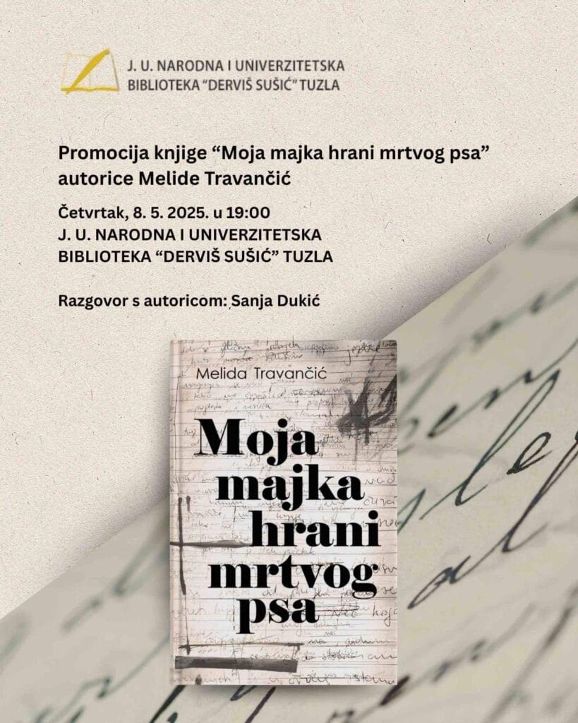 Promocija knjige Melide Travančić “Moja majka hrani mrtvog psa” održati će se u četvrtak 8. maja u 19 sati u našoj Biblioteci.