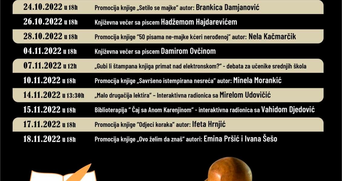 Read MoreU subotu 24. septembra 2022. godine u 18 sati u tuzlanskoj biblioteci “Derviš Sušić” održati će se književno veče sa Alminom Kaplanom. Moderatorice: Enisa Alibalić i Manda Ilić. “Na prvim stranicama svog dnevnika, Almin Kaplan je zasadio sjemenke paradajza. Na zadnjim stranicama knjige, on će već zrele paradajze pobrati i spremiti za ručak. Može li […]