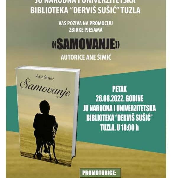 JU Narodna i univerzitetska biblioteka “Derviš Sušić” Tuzla Vas poziva na promociju zbirke pjesama “Samovanje” autorice Ane Šimić. Petak, 26.08.2022. godine, JU Narodna i univerzitetska biblioteka “Derviš Sušić”Tuzla, u 18:00 h Promotorice: mr.sc Indira Durmić Pekarić, prof. mr. sc Enisa Žunić