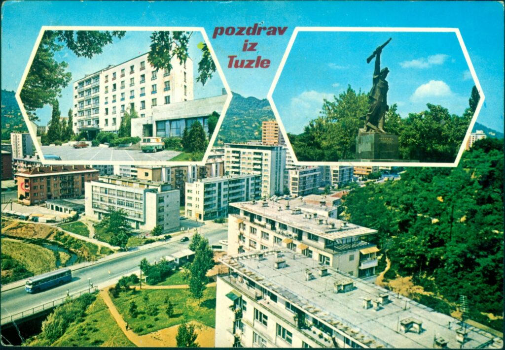“Pozdrav iz Tuzle”. Hotel “Bristol” (ulaz) sa Lječilištem Slana banja II (Melain) / “Spomenik rudarima palim u Husinskoj buni i revoluciji, Kreka”, akademskog vajara Ivana Sabolića (“Husinski rudar”) / Ulica Maršala Tita, rijeka Solina (autobus Saurer FAP “Ikarus” G-80), djelimično vidljiva: prodavnica PTK (Prehrambeno-tekstilnog kombinata) Prehrana “Fidelinka”, Bulevar.