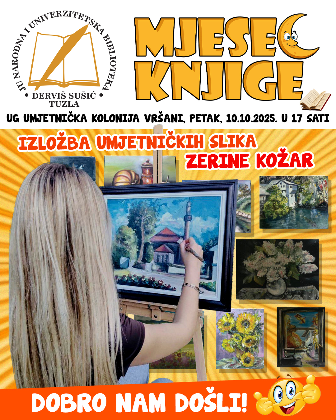 Isti dan u 17 sati  članica UG Umjetnička likovna kolonija “Vršani” Zerina Kožar, učenica IX razreda OŠ “Slavinovići” predstaviti će svoju izložbu umjetničkih slika na temu: “Pejsažna komponenta emocija”.