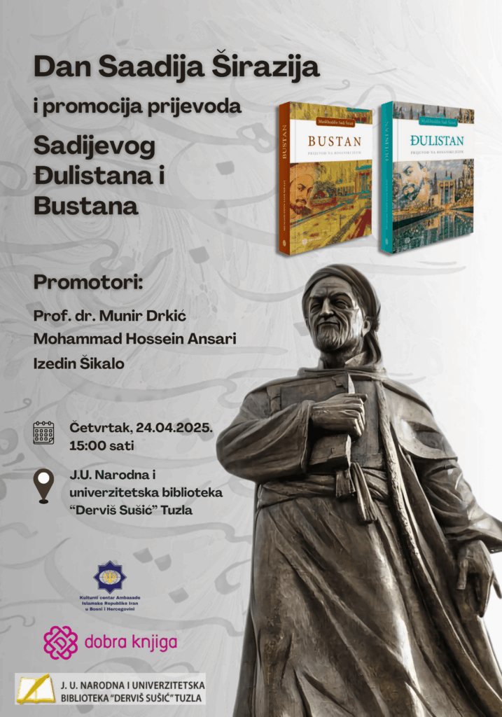 pozivamo vas da prisustvujete promociji prevoda Sadijevog Đulistana i Bustana koja će se održati u četvrtak, 24.04. sa početkom u 15:00 sati u Narodnoj i univerzitetskoj biblioteci “Derviš Sušić” Tuzla.