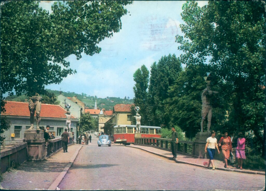 “Tuzla: Most sa kipovima”. (Djelo arhitekte Bogdana Đukića, skulpture “Tuzlanski kandelabri I-IV” djelo akademskog kipara Franje Ledera.) Djelimično vidljivi: Zatvorena tržnica arhitekte Bogdana Đukića (Robna kuća “Elma”, Gradska pijaca), zgrada “Barok”, Zvonik Rimokatoličke crkve. (Autobus: Saurer FAP “Ikarus” G-80; automobil: “Volkswagen” TAS “Buba”.)