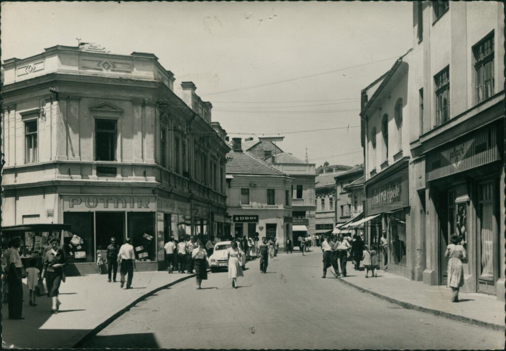 “Tuzla”, snimio M. Mrđanov. Ulica Maršala Tita (Glavna ulica); Korzo (“Polje”). Turistička agencija “Putnik”, reklama za putovanje na čuvenu Svjetsku izložbu Bruxelles 1958. “Expo 58”; lijevo: kiosk, Mala ulica; gore: Zubar (automobil “Škoda” 1200/1201 registarskih tablica “БХ 3647”); “Obuća”, Urar, Srećke; Istočna (“Poljska”) kapija, (zvonik Katoličke crkve, brdo Kicelj); prodavnice “Naprijed”, “Seljanka”, “Astra cipele”; Prodavnica tvornice šećera i kandita Osijek “Plavi 9”.