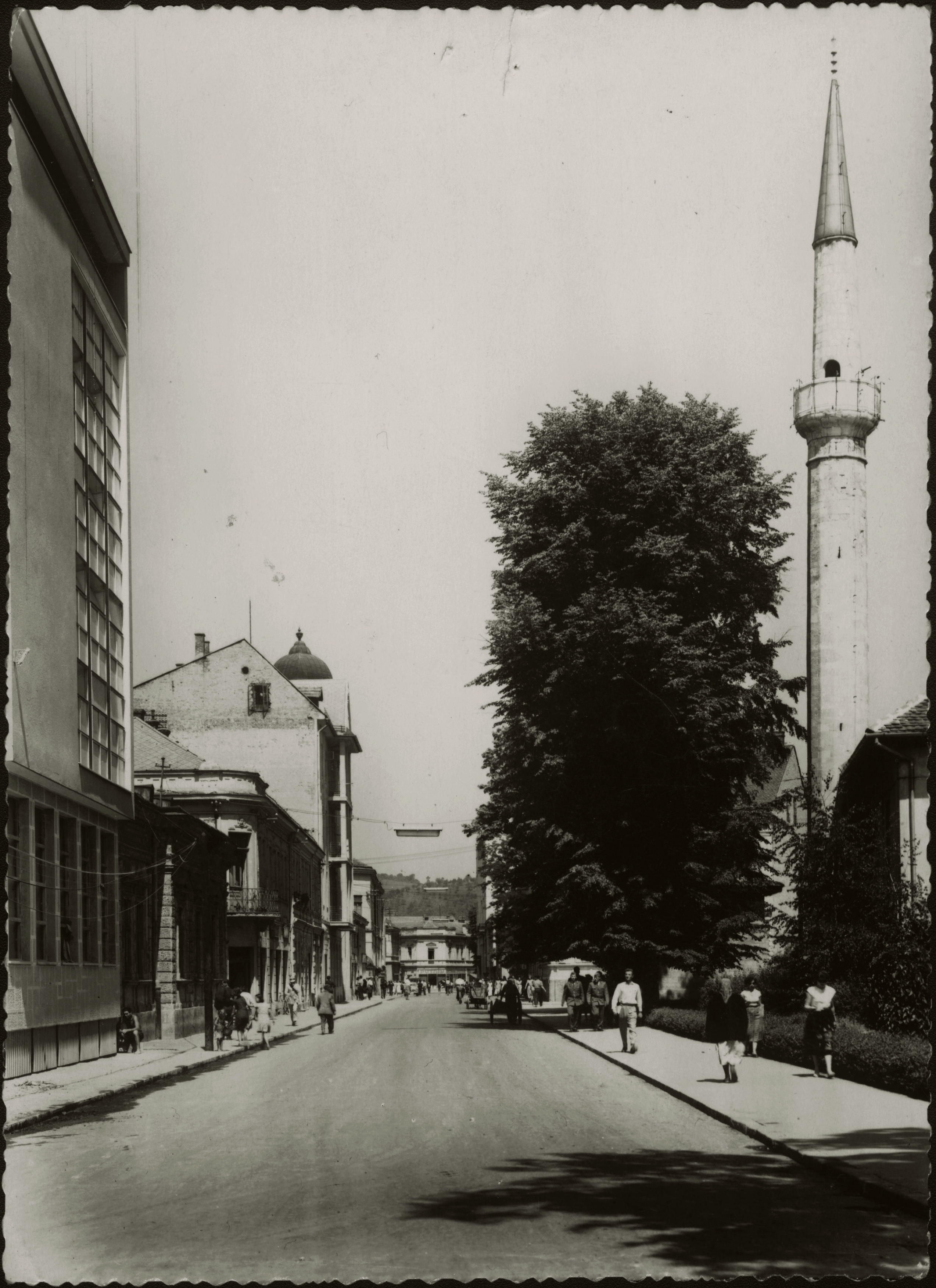 “Tuzla”. Snimio M. Mrđanov. Ulica Maršala Tita (Glavna ulica). Korzo (“Polje”), Gazi Turali-begova (Poljska) džamija, Turbe, “Grafičar” (Šusterova palata), Turistička agencija “Putnik”.